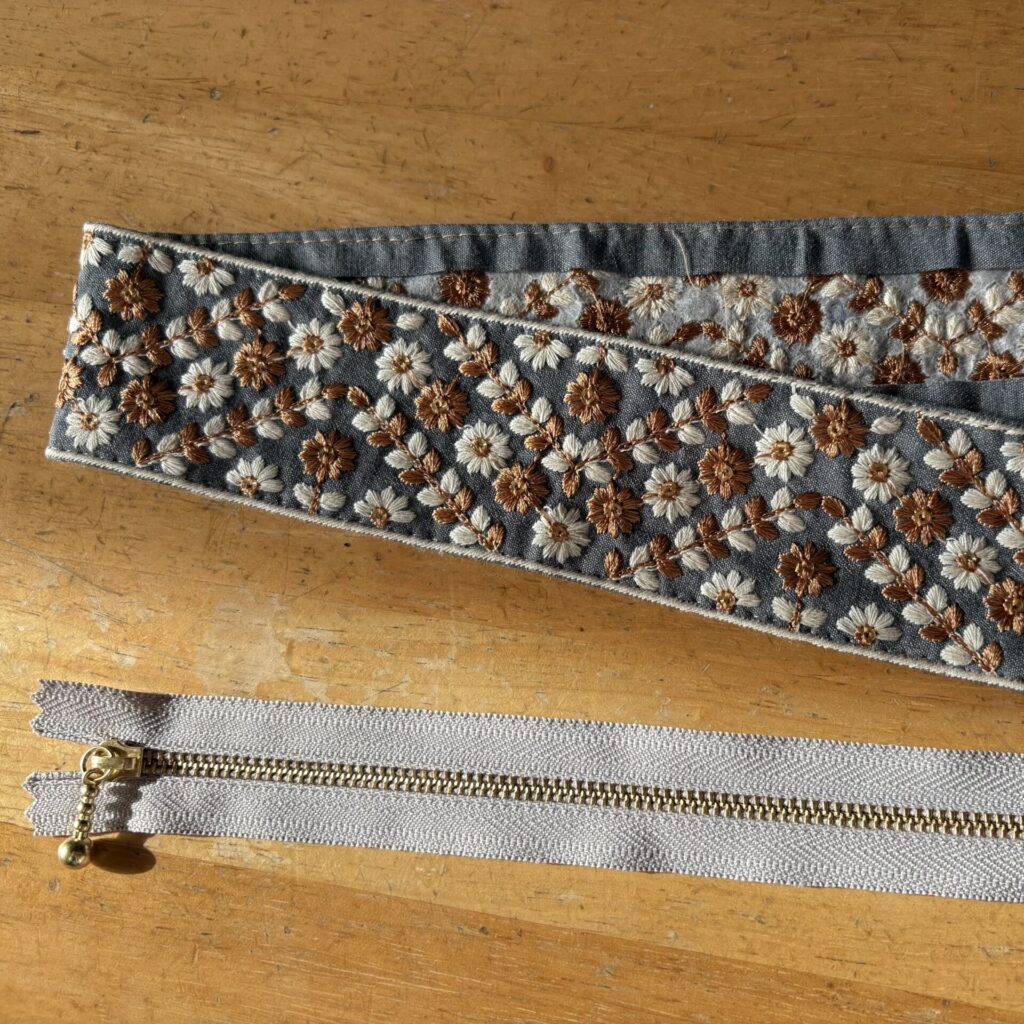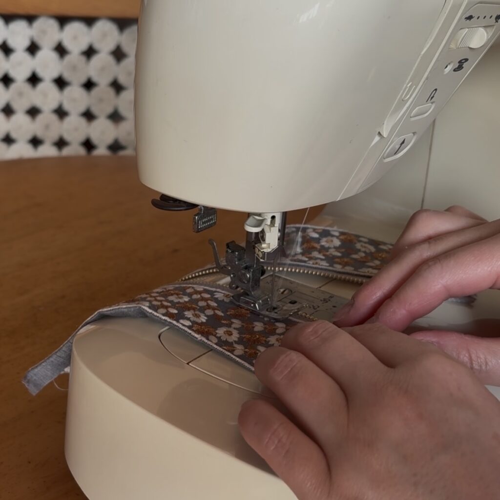 ファスナーの両脇にリボンを縫い付けていきます。