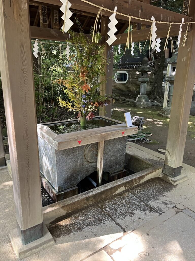 少し進んで、左に手水舎があります 水盤に花が飾ってあって綺麗ですね