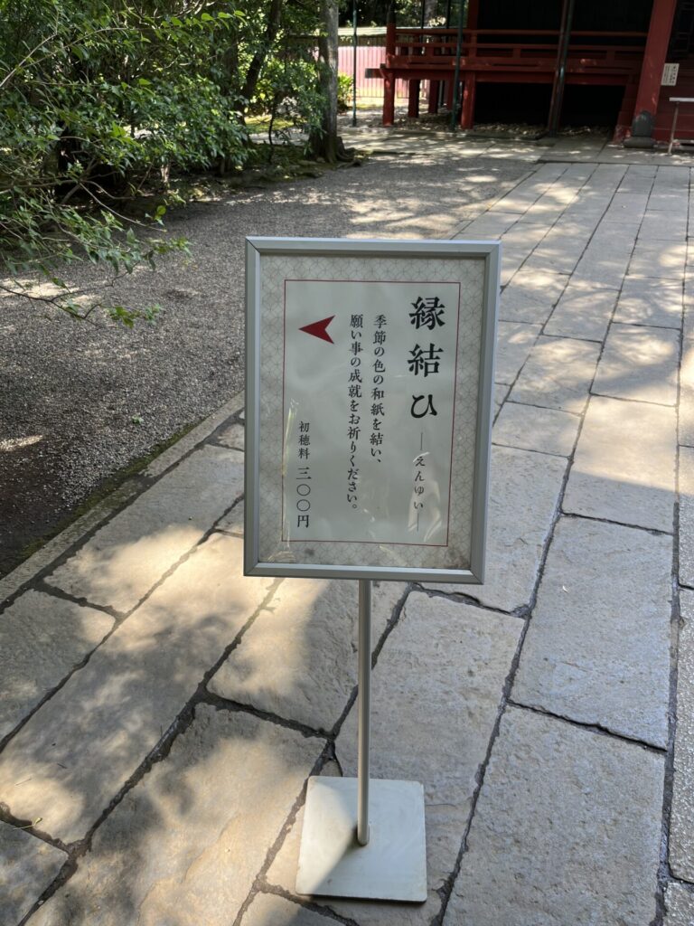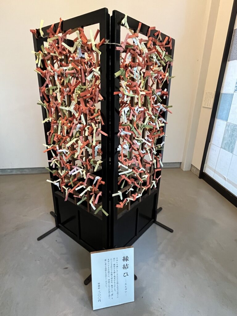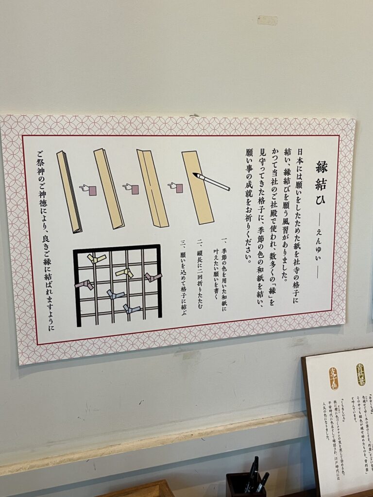 社殿左は、縁結いーえんゆいー 季節の色の和紙を結い、願い事の成就をお祈り下さい
