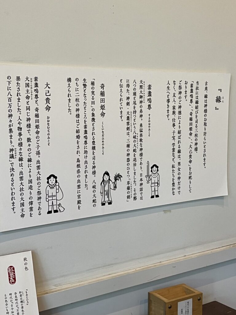 素戔嗚尊と奇稲田姫命は夫婦の神様であり、大己貴命は「むすび」の神様であることから、縁結びの御神徳があるとされています