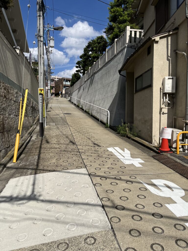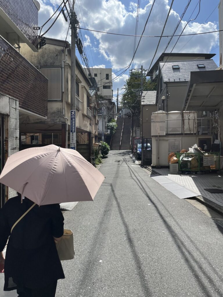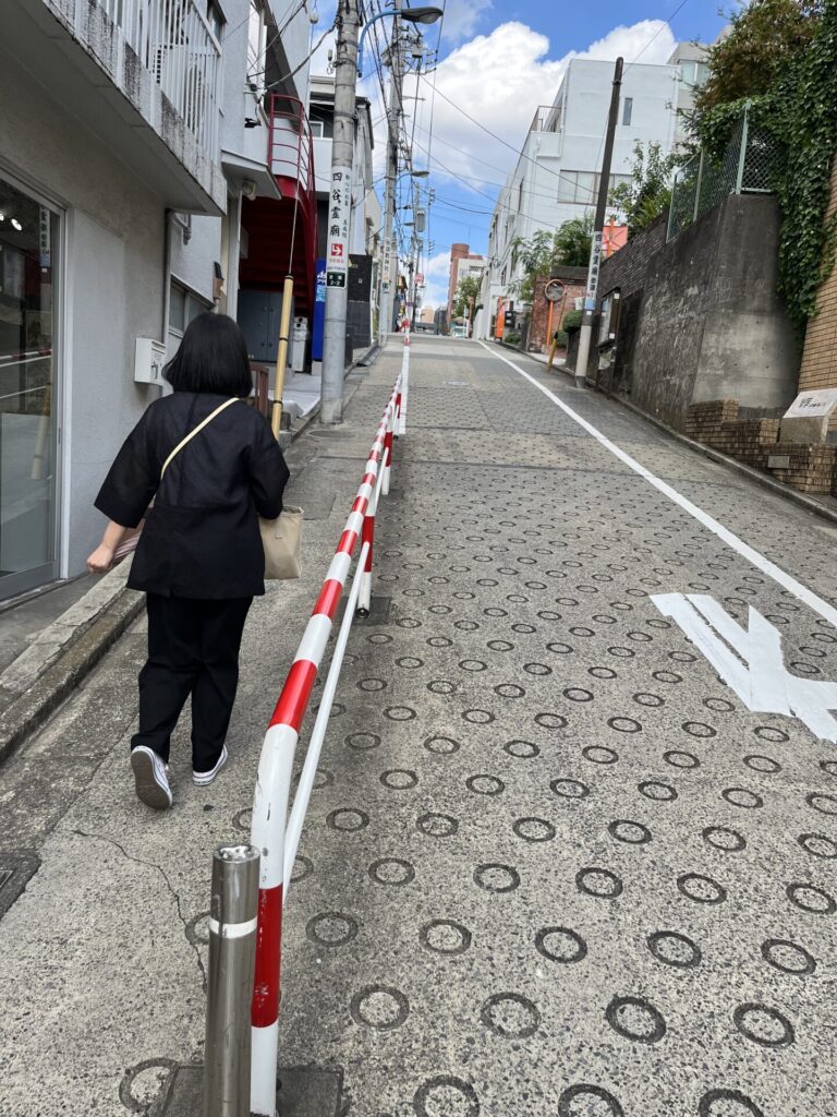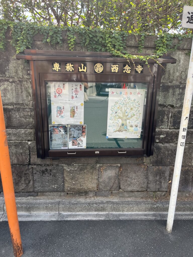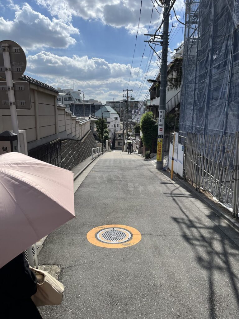 お寺の周りの細い道を通り、最後の目的地を目指します ここで、また激坂「観音坂」の登場です 西念寺と真成院の間を南に下る坂 坂名は真成院の潮踏観音にちなむ 潮踏観音は、江戸時代以前に四谷周辺が「潮踏の里」と呼ばれたことにちなむ