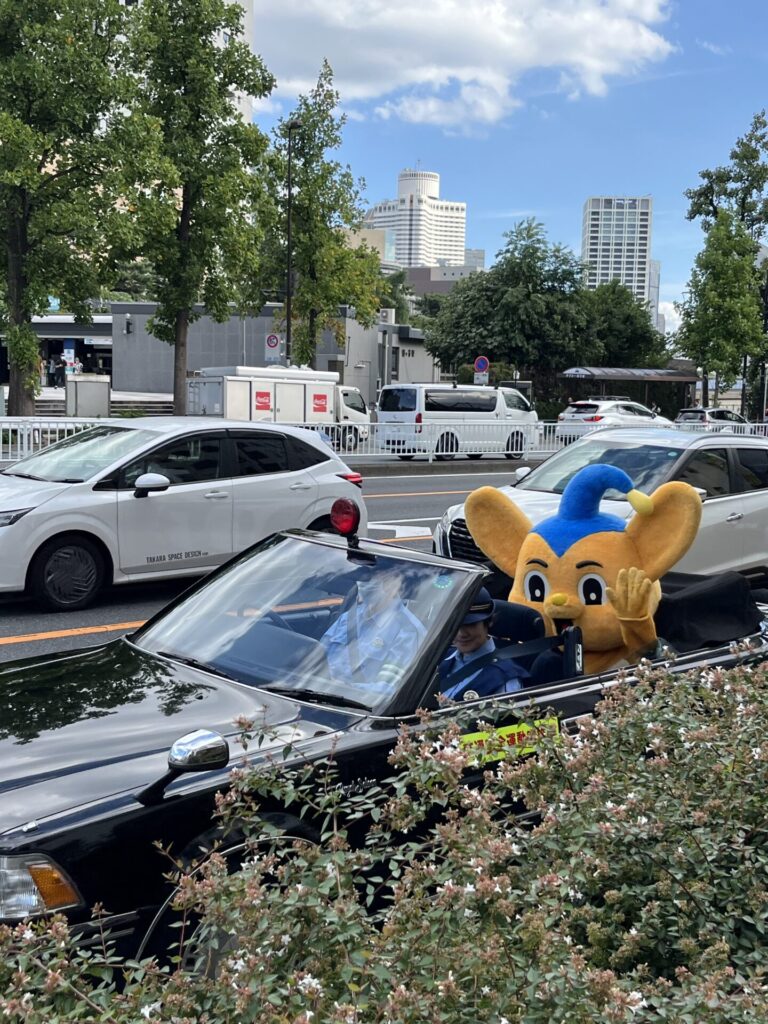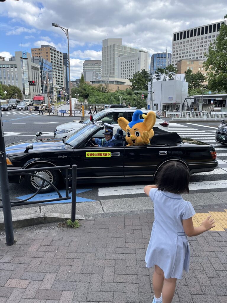 四谷見附交差点に帰って来ました っと、オープンカーにピーポー君 かわいい💕 子供に混じって、手を振ります👋 全国交通安全運動実施中ですね 安全運転心がけまーす😄