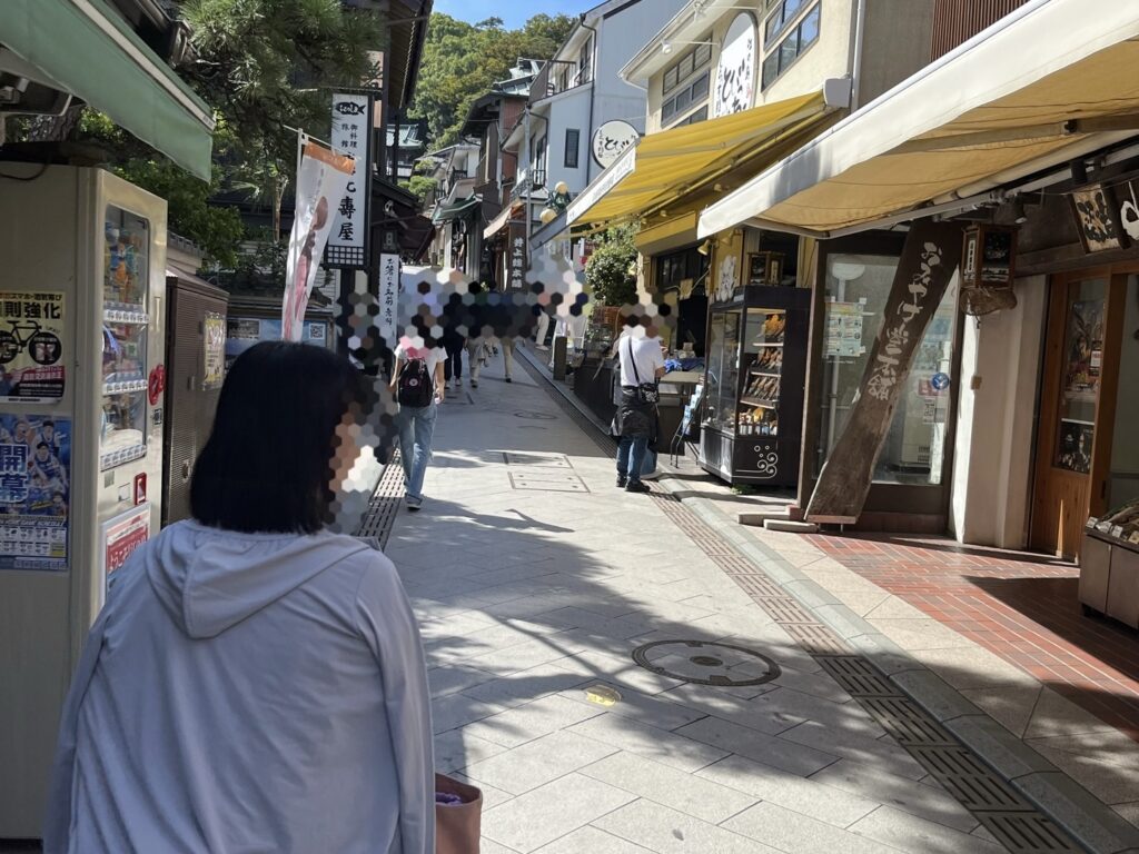 江の島仲見世通りを歩きます 左右にお店が立ち並ぶ、賑やかな通りです 道幅は、昔も今も変わらず同じだそうです