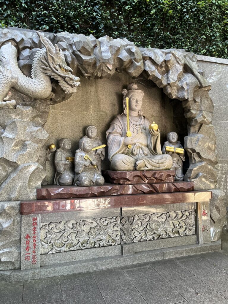 門をくぐった正面にある弁財天童子石像は、弁財天顕現の一場面、江島縁起に基づくそうです