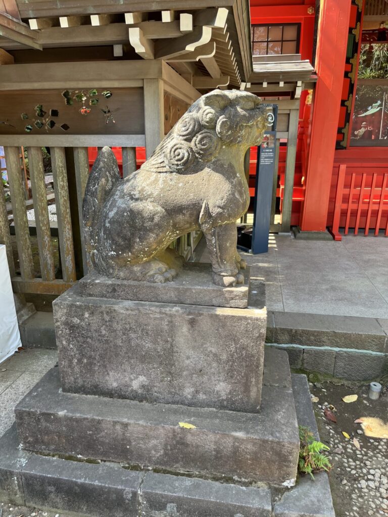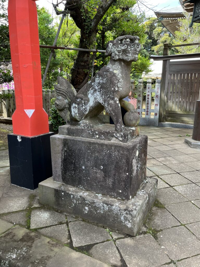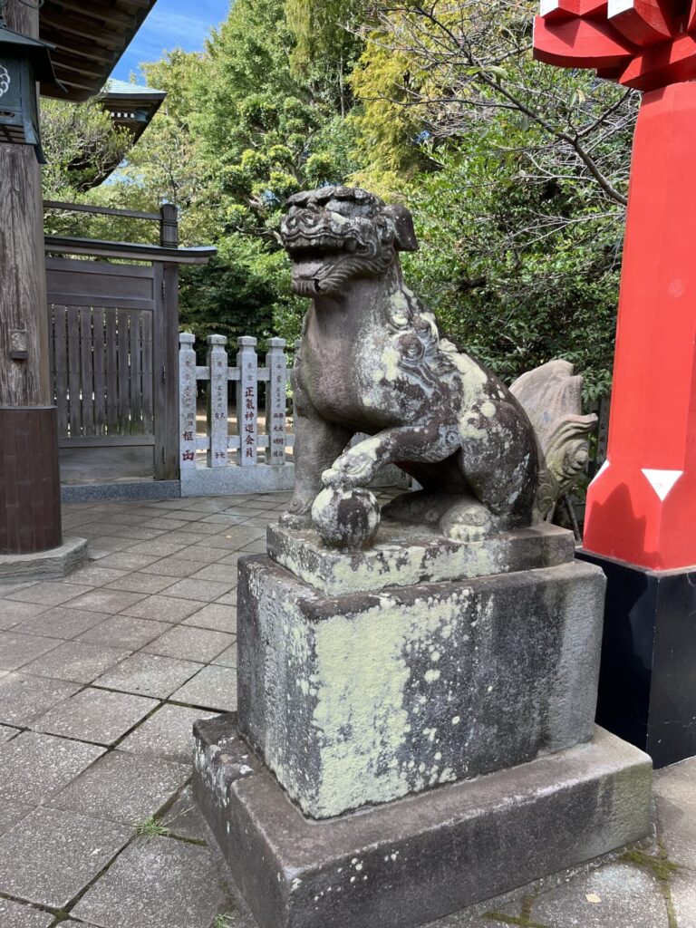 階段を上ると朱色の鳥居があります 鳥居の両側には、古そうな狛犬が、独特なお顔をしています