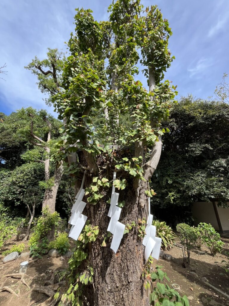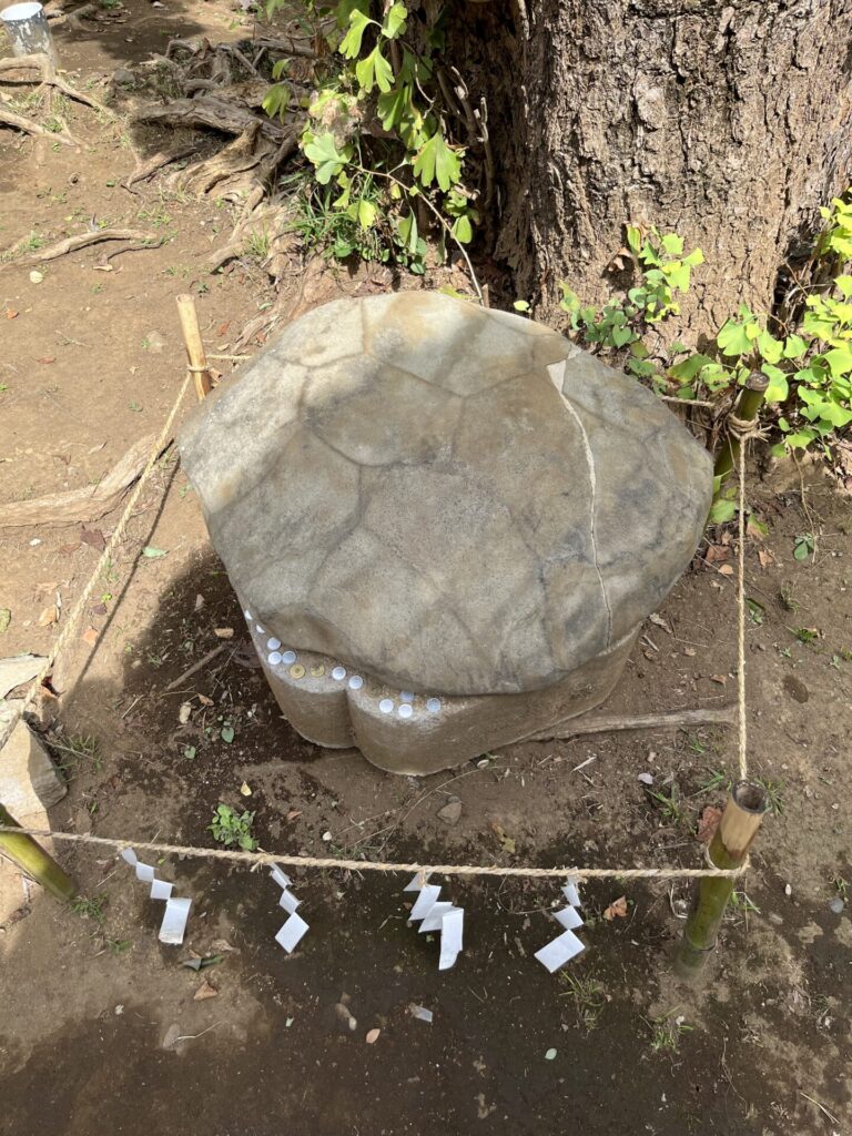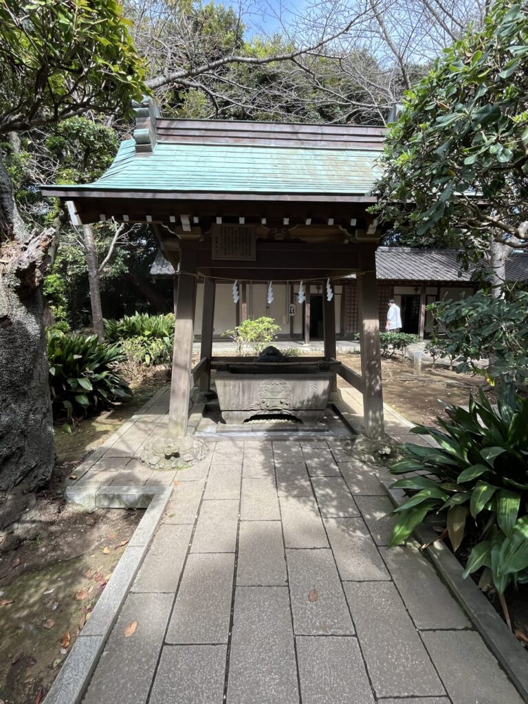御手水舎は東京材木問屋熊野屋安兵衛の奉納で青銅の亀は東京在住の青山健作氏が再複奉納したのもです 現在、水は張られていません しめ縄の巻かれた御神木の下には、鎌倉四名石の一つ亀甲石 亀の甲羅の模様の石が不思議ですね