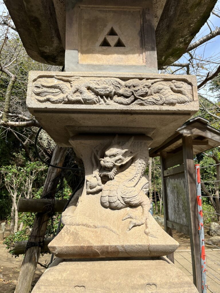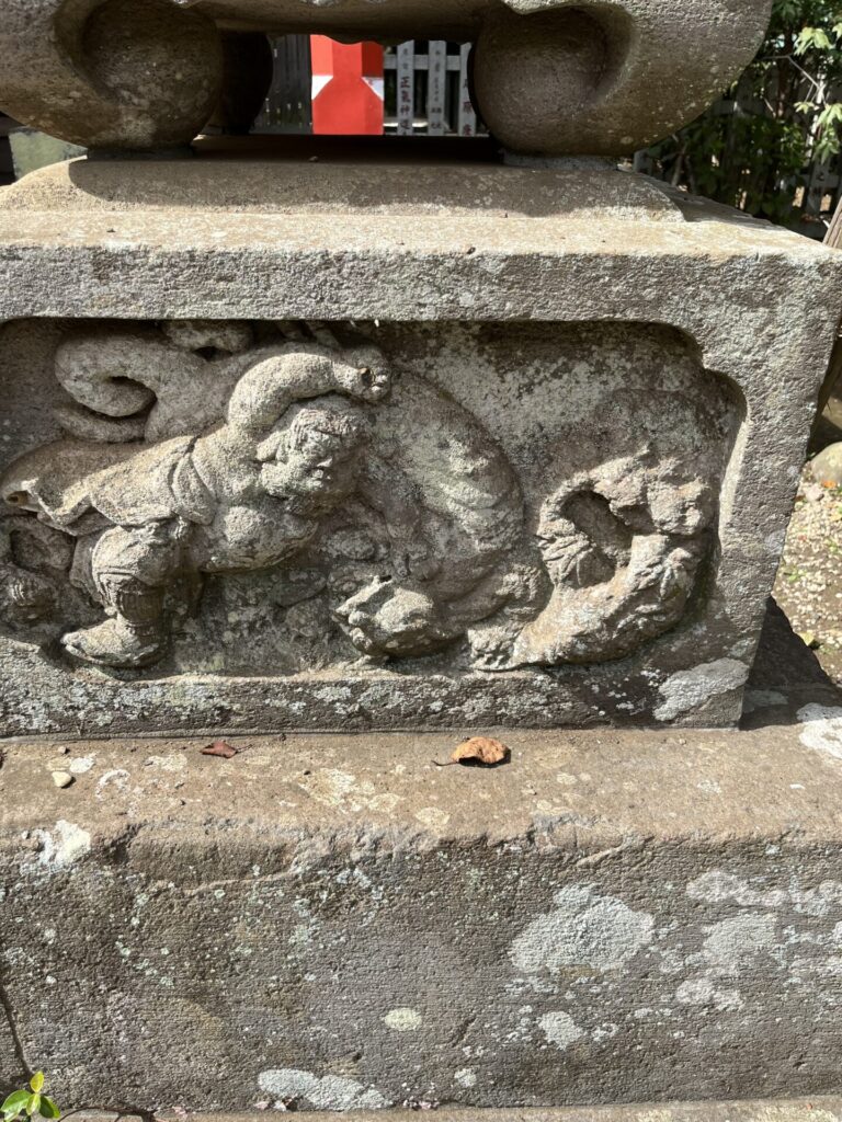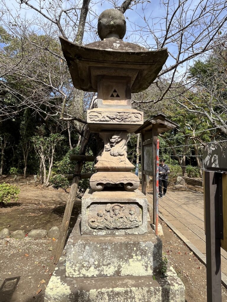 奥津宮灯籠 台座に浮き彫りされた天女や獅子は見事で、島内の石造物でも逸品と言われています