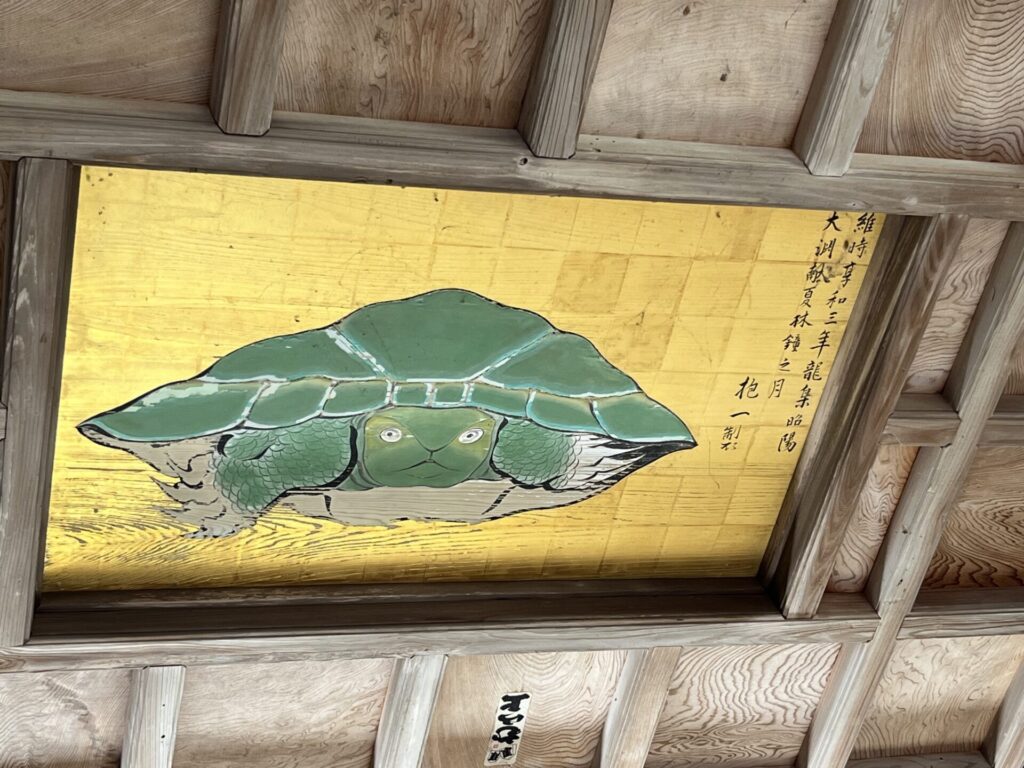 拝殿の天井に描かれた亀の絵(模写)は、江戸時代の絵師・酒井抱一の作と伝えられています