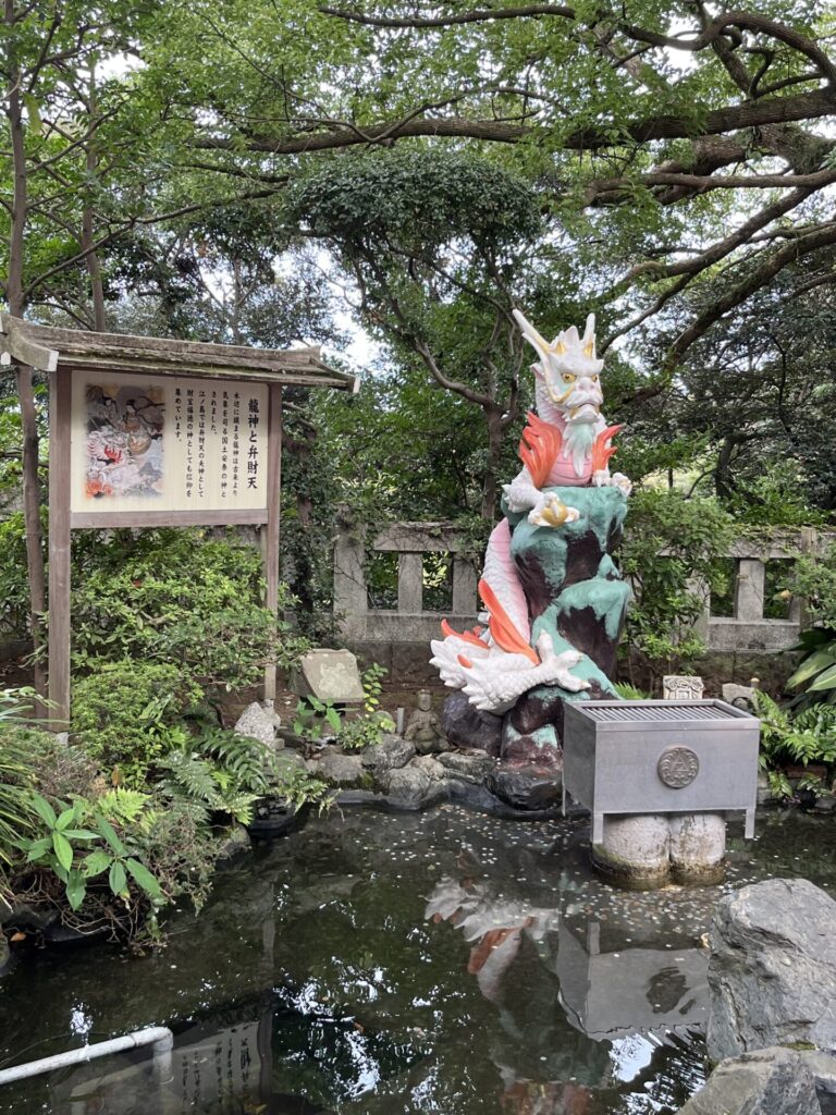 社殿左に、銭洗白龍王 龍の池で硬貨を洗うと金運向上のご利益があると言われています