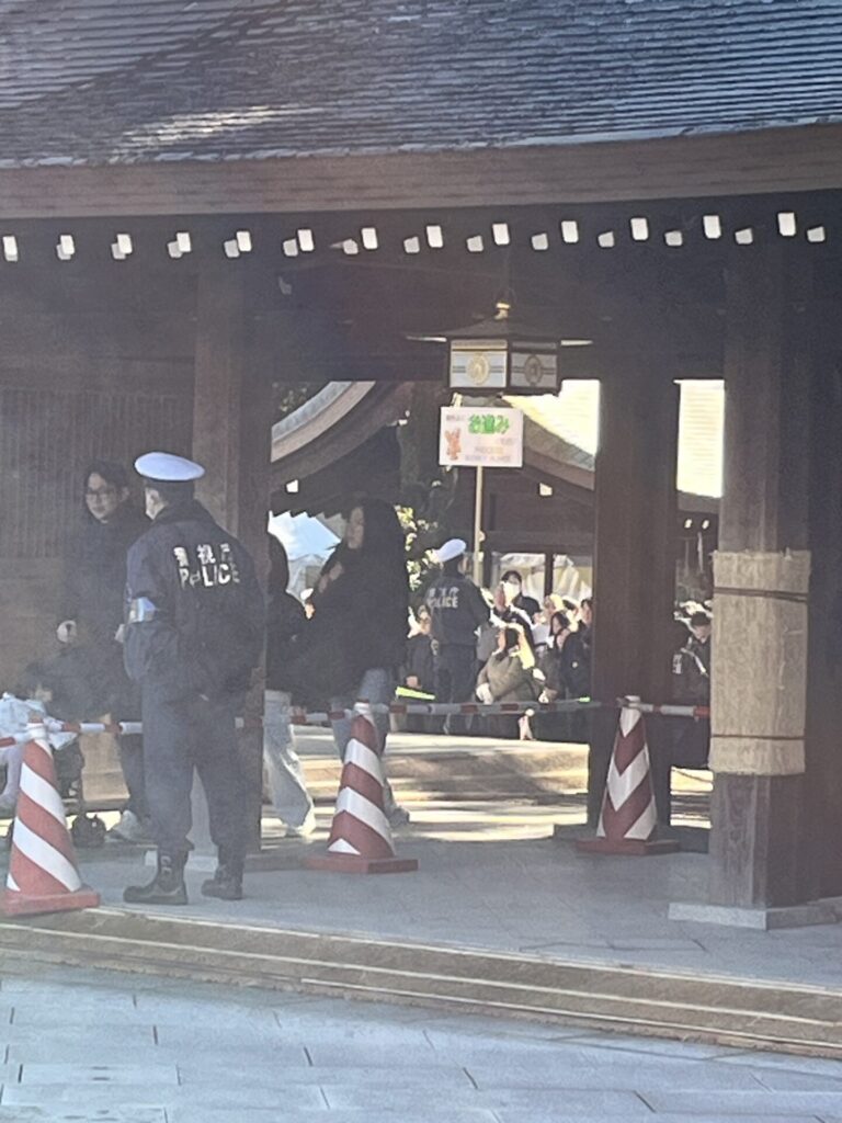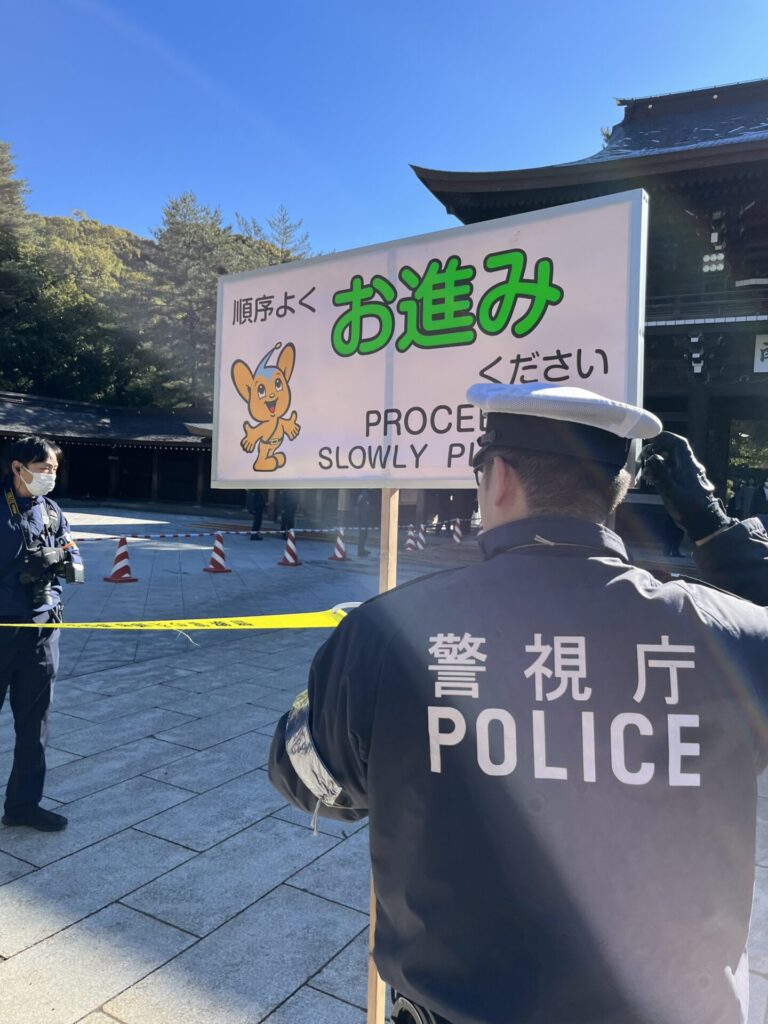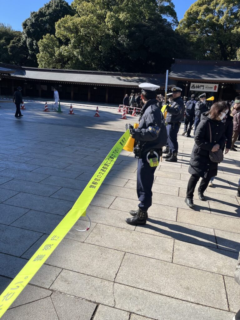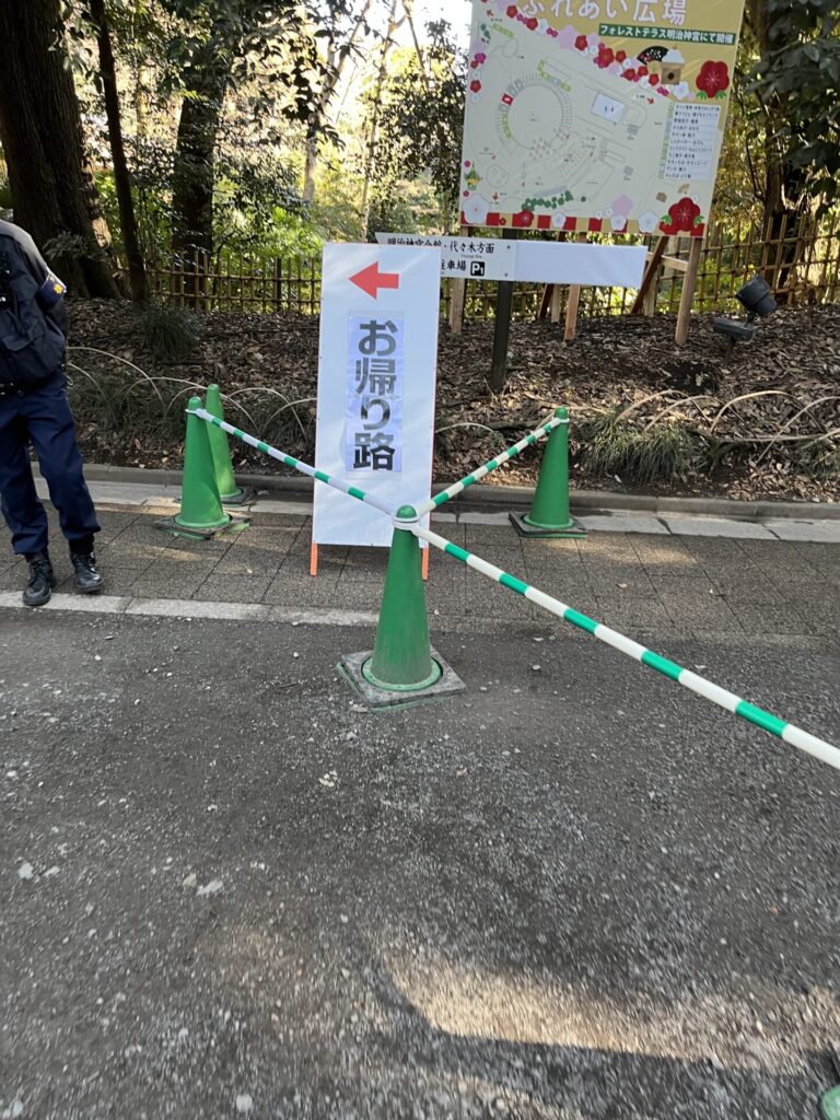 警察官の方々が、プラカードとテープで誘導しています お疲れ様です🫡 おかげさまで、日本一の参拝客を誇る明治神宮の安全が保てれています