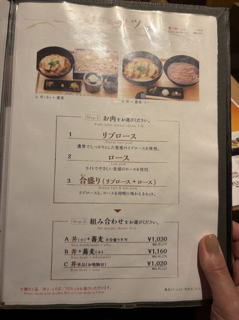 セットのかつ丼は、リブロース 、ロース 、合い盛りの中から選ぶことができ、 今回は、合い盛りを注文
