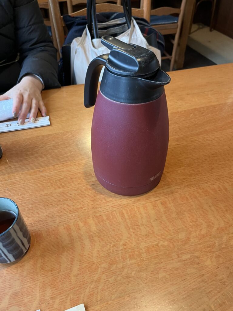 広い店内、天井を見上げると、立派な梁や小屋組 関心してしましました うれしいお茶の飲み放題 ポットでどうぞ😁