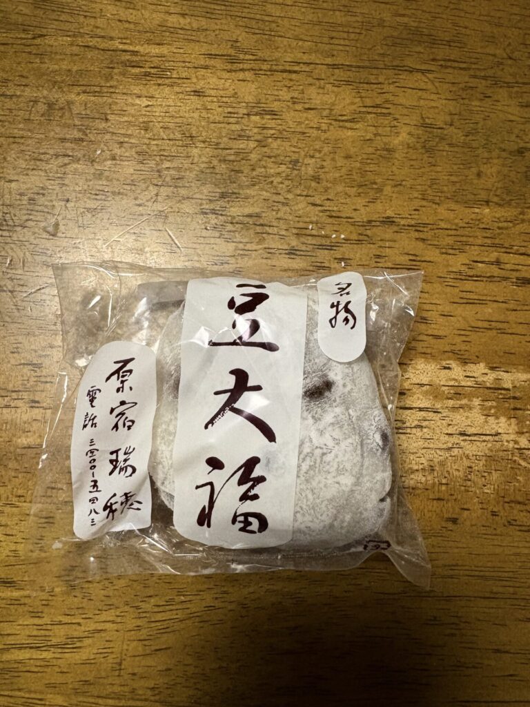 大きめでとても柔らかな豆大福、豆がそこまで主張せず甘めの豆大福だなと感じました