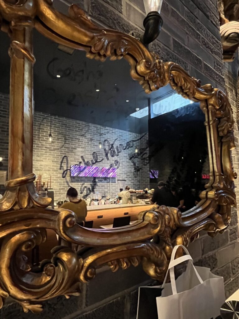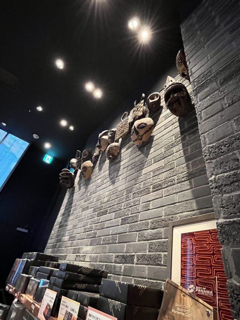 おしゃれな店内、壁に掛かったお面がちょっと怖い😱
