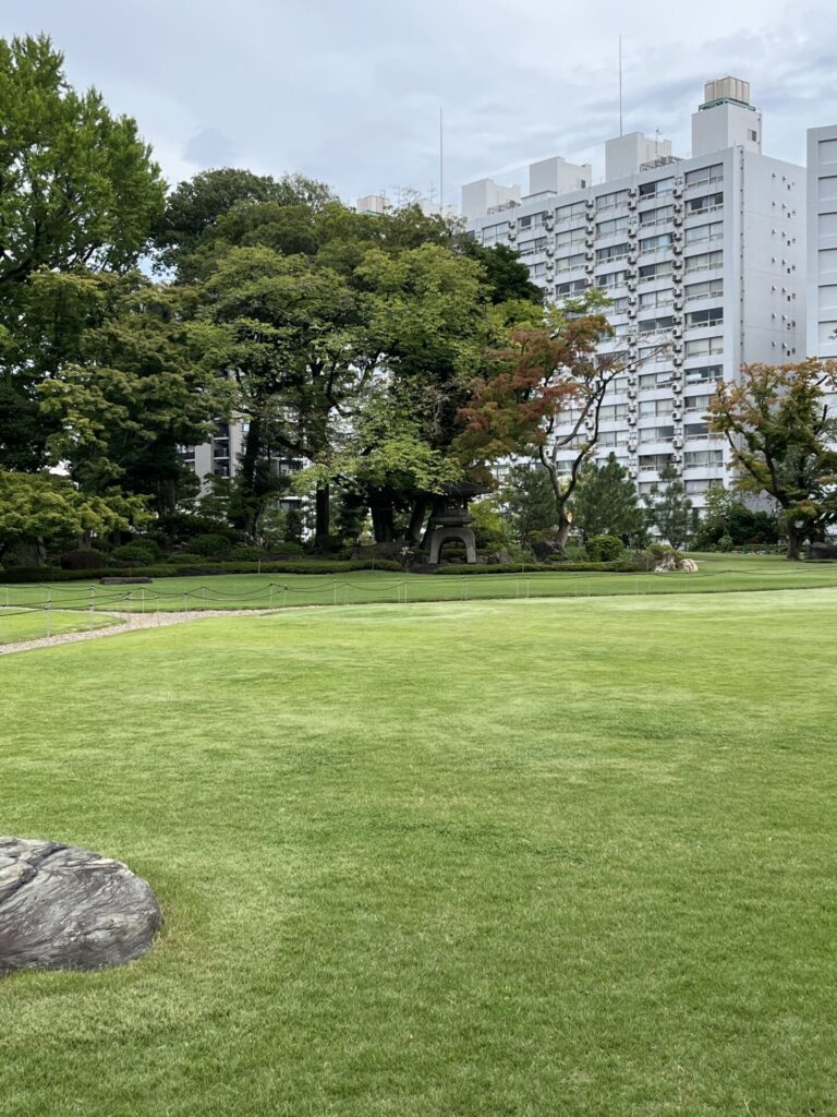 振り返って、庭園ビュー 芝生が鮮やか、奥には、木々が大きな石灯籠の見えました📷
