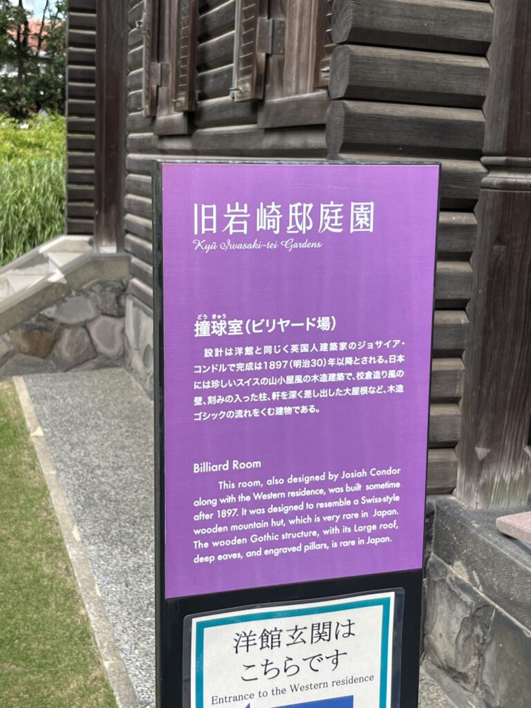 旧岩崎邸庭園内の建物は、三菱の創始者岩崎家本邸の旧宅です 庭園内のうち洋館と撞球室は、J.コンドルの設計で、明治29年に建築されました 洋館は木造2階建て、地下室付で、明治洋風建築を代表する建物です 洋館に併設された和館は書院造りを基調とし、棟梁は大河喜十郎と伝えられています