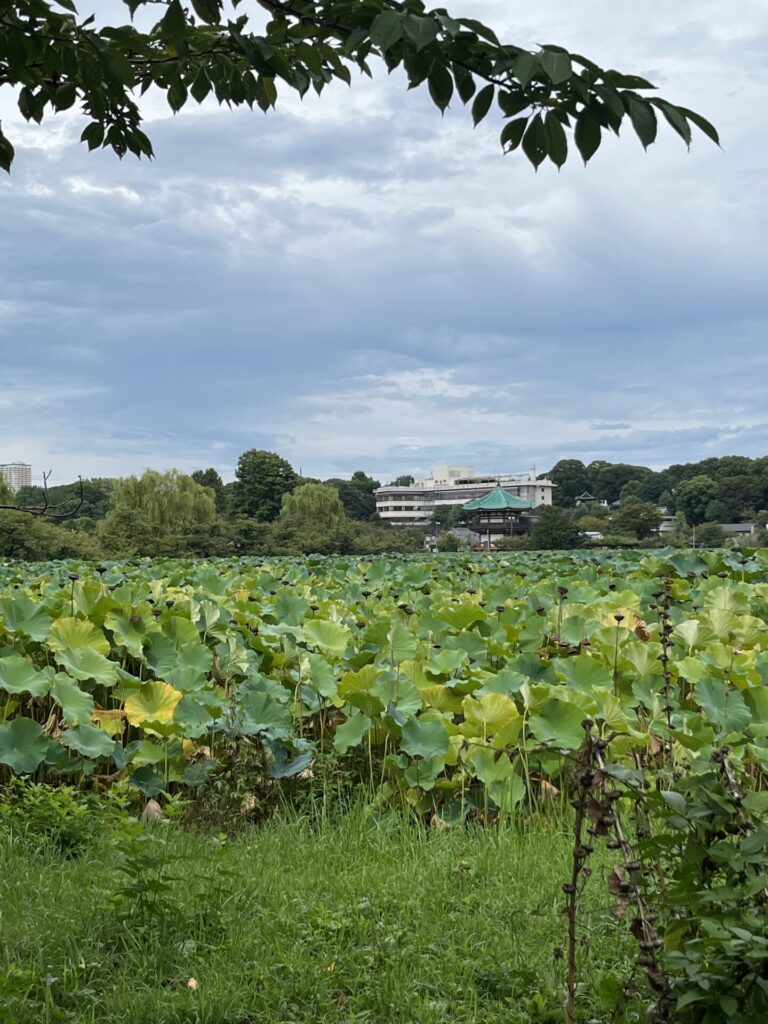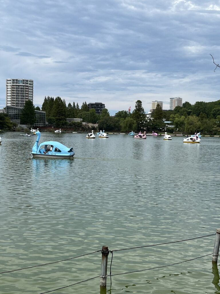不忍池の蓮子が大きく育ってますね 反対側は、足漕ぎボートがたくさん 小さい子供がいたら楽しいでしょうね