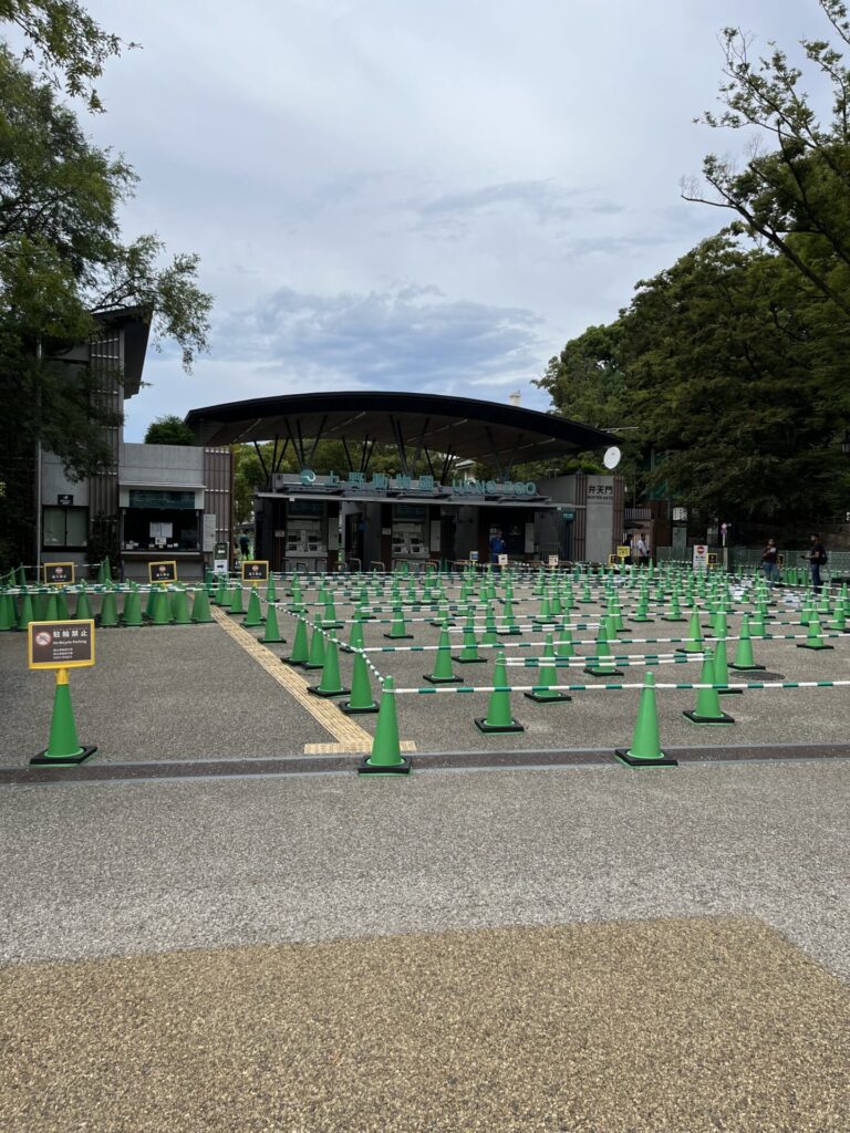 不忍池辯天堂の先、天龍橋を渡ると、左に上野動物園弁天門 ジグザグのカラーコーン 開園には混んだのかしら 道路を横断して、階段を上ります