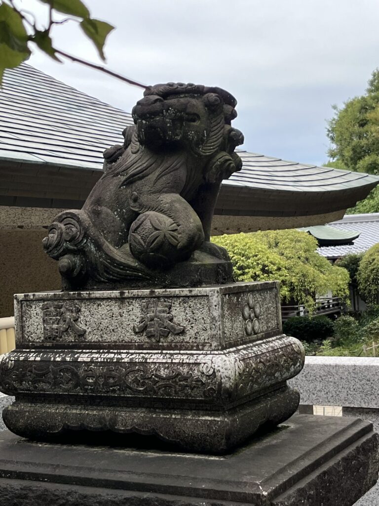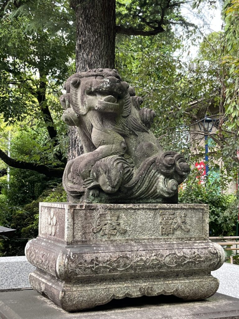 歴史がありそうな狛犬のお出迎え 階段を下りて社殿に向かいます