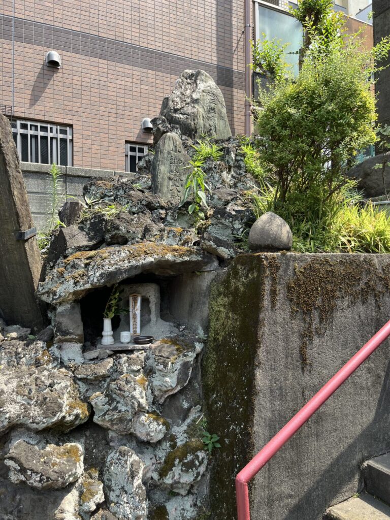 道路より低い位置に境内がある「下り宮」と呼ばれる珍しい造りです 階段を下がる途中、右手には富士購関係石碑群(千代田区指定文化財) 昔は境内に富士塚が築かれていましたが、現在では取り壊されて現存していません